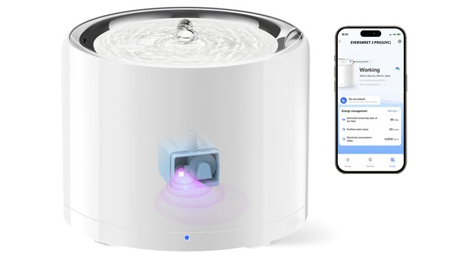 This pet water fountain features a wireless pump and UVC disinfection to kill pathogens. Quiet operation at 25dB ensures a serene environment, while the 1.35L/46oz capacity can provide enough fresh water for a single cat for 5-7 days.