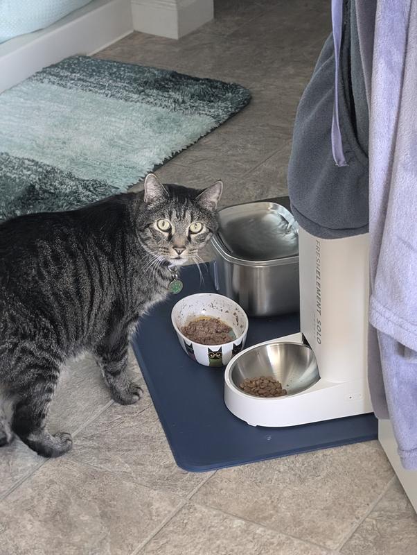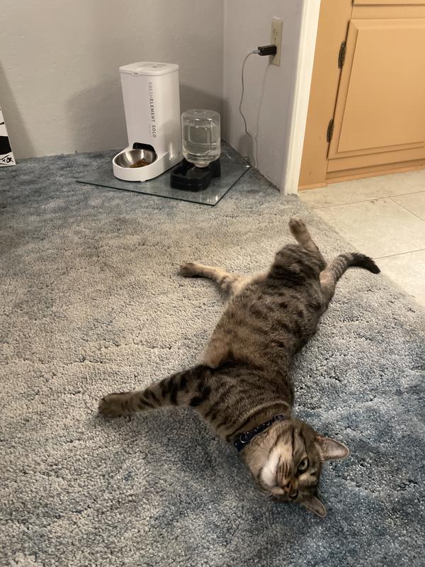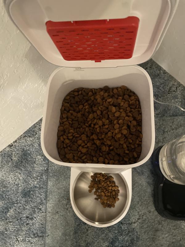 A triple fresh-lock system shields food from moisture, preserving its freshness and flavor. The feeder’s 12-cup capacity can feed a single adult cat for up to 15 days.