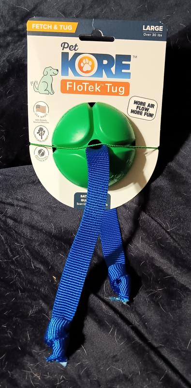Pet Kore FloTek Tug Fetch & Play toy wasn't a favorite of my dog. She loves playing ferch and tug with me, but i couldn't get her interested in this toy no matter what i did. The ball is very well made of real rubber and breathing grooves. It has cute vibrant colors. It's made in the USA. You can wash it in the dishwasher; top rack. It bounces perfectly. I feel like its made to last a very long time. I'll keep working with her. I love it and feel like she should, too.