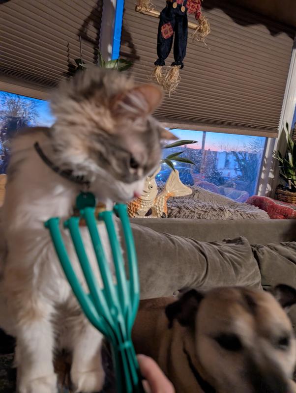 I absolutely love this cat scatcher/comb.Great for de-furring my babies. And they love the feel of the comb scratching their backs. And the only one they really like.