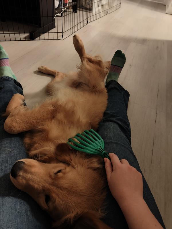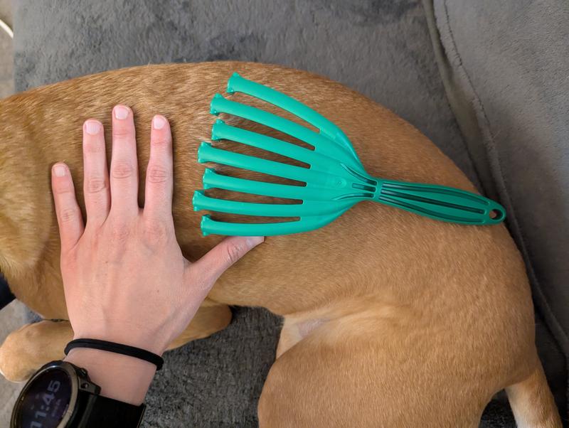 - Individual, flexible fingers contour to your pup’s body for a thorough grooming experience.
