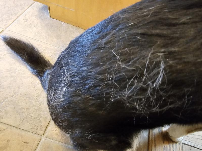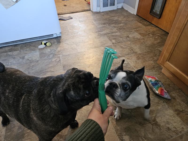 Right off the bat, both dogs were super interested in the brush and would not stop sniffing at it. So good start. I think this tool was a bit too intense for my