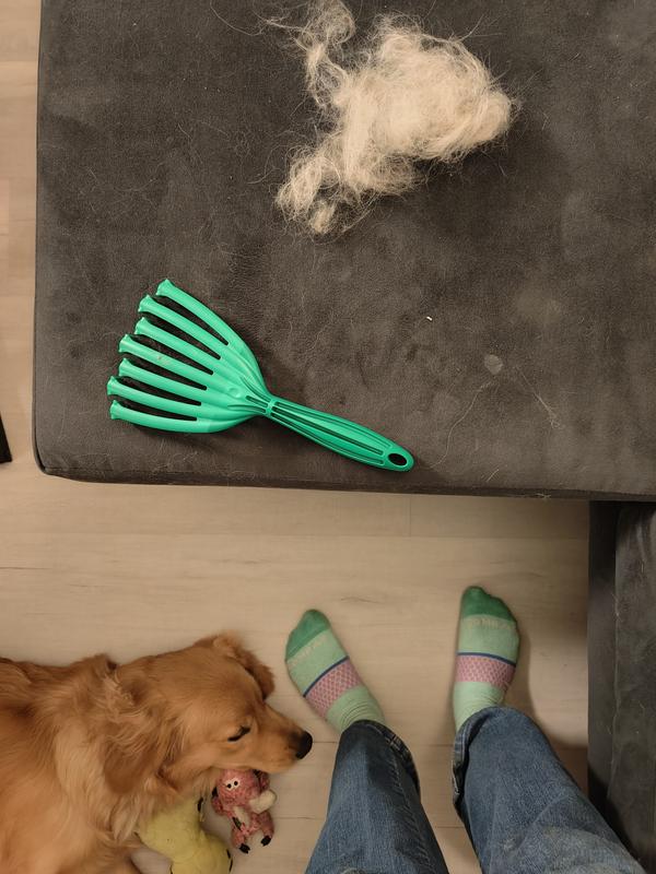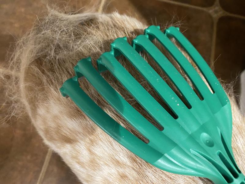 I liked that this product was lightweight and my dog seemed to enjoy the "fingers" that it has. My dog has a very dense coat, and this did not seem to get to the undercoat since the teeth are rather small. Also the fur didn't accumulate on the product but was left on my dog--which made it a little difficult to clean up.