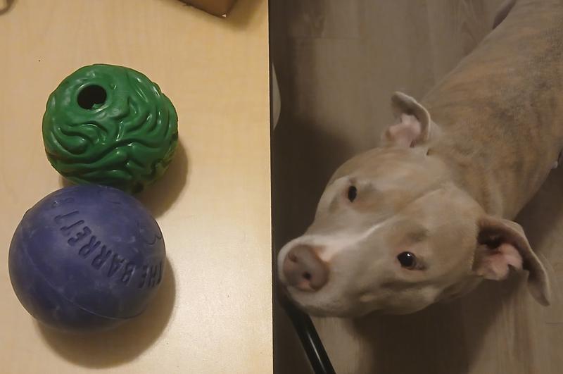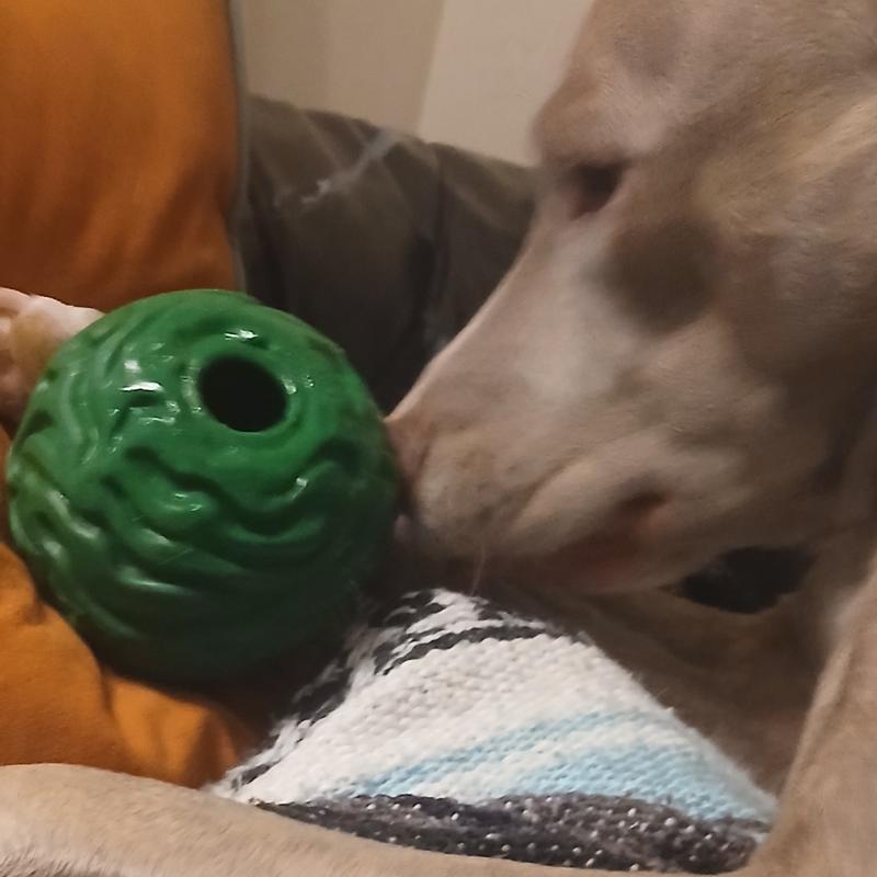 I LOVE this ball! My dog has a tendency to sit and “work” on something until he picks it apart and not only is this designed for that type of behavior - he hasn’t been able to tear it yet! I love the easy grip he can get on it. My only slight complaint was the smell of the rubber, but we did a quick wash with dawn soap and a rinse and it was fine. For the price, I was worried it wouldn’t be worth it but I’m honestly impressed!