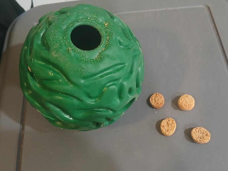 Wow-finally found a toy that my dog did not chew apart in an hour! So far so good...this ball has proven extremely challenging to her. I am delighted to have finally gotten my Oney's worth. It is several weeks old now and looks to be a keeper. I highly recommend if your fog is a chewer!