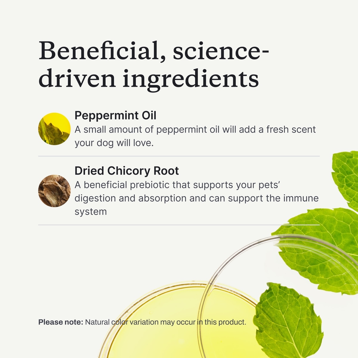 PetLab Co. Prebiotic Dental Sticks Dog Dental Chews, 24 count—Take charge of your dog’s dental health with Petlab Prebiotic Dental Chews Peppermint Flavored for Dogs. These prebiotic treats are safe for everyday use and may help support fresh breath, gum health, oral hygiene, and her health thanks to the added prebiotics. Made with a scrumptious peppermint flavor, these sticks are free from harmful fillers, and when used daily and consistently, they may help with the root cause of bad breath—plaque and tartar buildup. Unlike your average doggy toothbrush, these dental sticks get those hard-to-reach places, supporting gum health and overall oral hygiene. One important ingredient in this supplement is inulin, also known as chicory root. This naturally occurring prebiotic is known for its potency and to be able to support your dog from within as well as her natural immune system. Your dog will love chewing on these sticks, and you’ll love knowing that they are made with only unadulterated, non-synthetic, genuine ingredients where possible, including coconut oil, peppermint oil, and ground flaxseed."