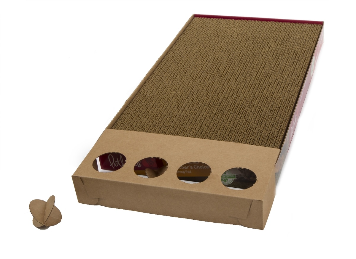 I place several cardboard scratchers around the house for my two cats to use as their fancy strikes. The scratchers are simple and my kitties really use them to scratch and sometimes just sit on. Something about a box! This one has a nice size to it for my large kitties. I sometimes drop a hard cat treat into the well for additional fun.