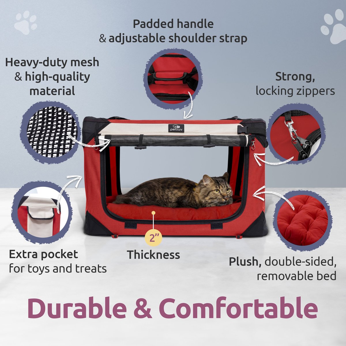 PetLuv makes travel easy and luxurious with details both you and your pet will notice: a plush washable pillow, 4 access doors, breathable mesh flaps, and privacy windows, plus locking zippers, seat belt loops, a storage pocket, and fold-flat design.