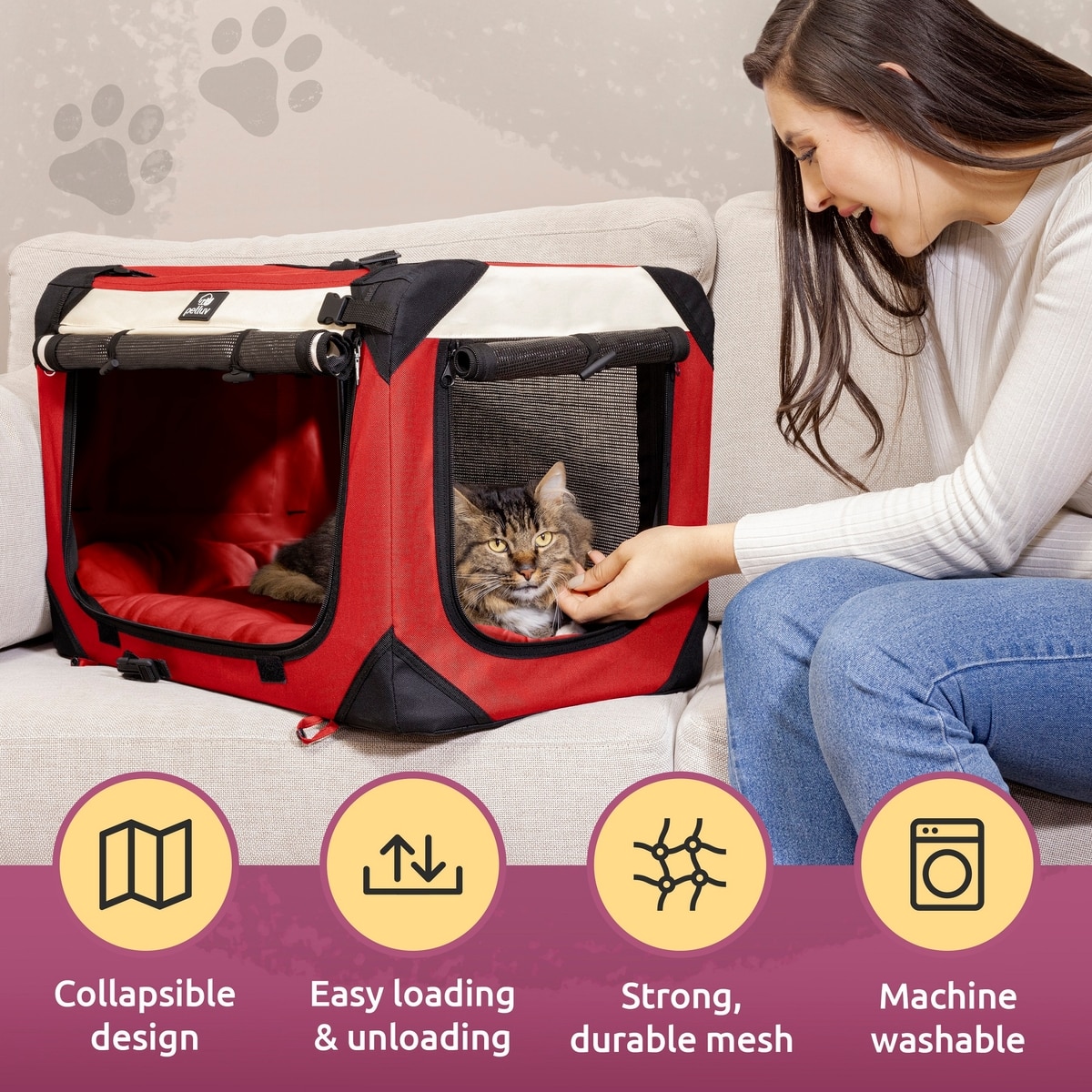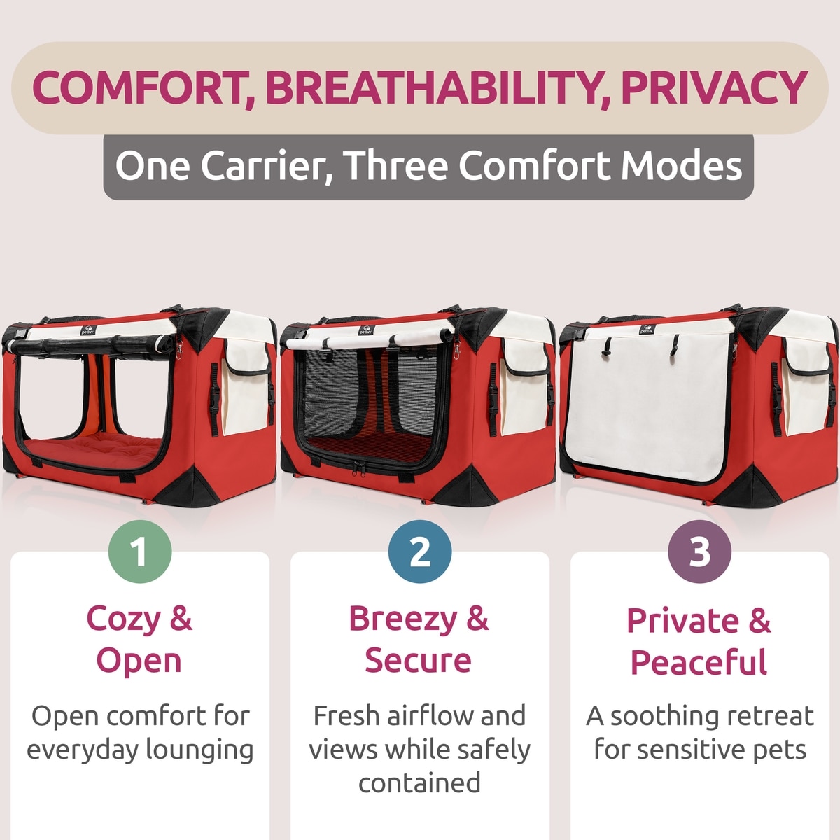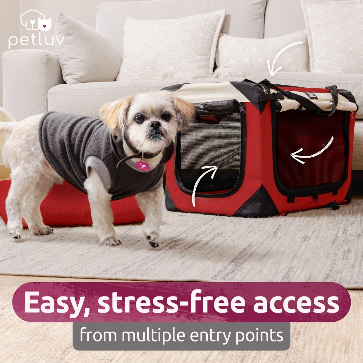 PetLuv makes travel easy and luxurious with details both you and your pet will notice: a plush washable pillow, 4 access doors, breathable mesh flaps, and privacy windows, plus locking zippers, seat belt loops, a storage pocket, and fold-flat design.