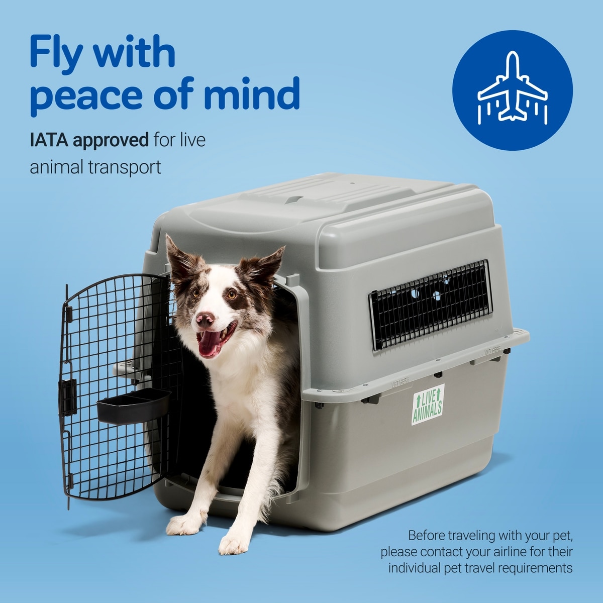 Each kennel size includes a clip-on food and water cup, "live animal" sticker, and absorbent kennel pad.