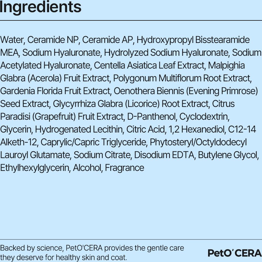 Water, Butylene Glycol, 1,2-Hexanediol, Ceramide(03), D-Panthenol, Glycerin, Caprylic And Capric Triglyceride, Centella Asiatica Leaf Extract, Sodium | Water, MMB, Phenoxyethanol, Cocamidopropyl PG-Dimonium Chloride, Cetyl Trimethyl Ammonium Chloride, Fragrance, Aloe Barbadensis Leaf Juice, Cannabis | Water, Cosmetic Grade Aminomodified Silicone-polyether Copolymers, Acetamidopropyl Trimonium Chloride, Hydrolyzed Silk Protein, Glycerin, DMDM | Aqua, Proprietary blend of advanced coat & skin conditioners/moisturizers/strengtheners, Hydrolyzed silk protein, Glycerin, Rosemary Extract, | Electrolyzed Oxygenated Water, Sodium Chloride, Hypochlorous Acid. | Lanolin, Octyl Salicylate ( Organic Sunscreen, ) Mink Oil, Vitamin E Oil, Water Based Silicon | — | — | Water, Aloe Vera, Natural-Derived Conditioners and Detanglers, Vitamin E, Jojoba, Olive Extract, Meadowfoam, Lavender, Wheat Protein, Glycerin, | Deionized Water, Stearylkonium Chloride, Hexadecanol, Ethosylated Lanolin, Aloe Vera, Jojoba Oil, Mineral Oil, Glycerin, Vanilla Bean | Deionized Water, Ammonium Chloride, Wheat Protein, Glycerides, Oat Protein, Aloe Vera Gel, Rosemary Extract, Chamomile Extract, Glycerin, | Deionized Water, Flaxseed Oil, Olive Oil, 5D Hyaluronic Acid, Lanolin, Bioenzyme, Antistatic Agent(Catanac SN), Hair Conditioning Silk(BP8134), |