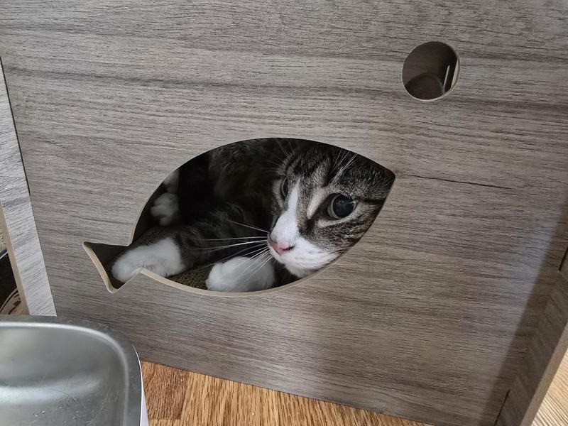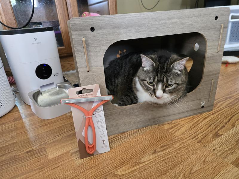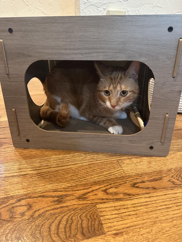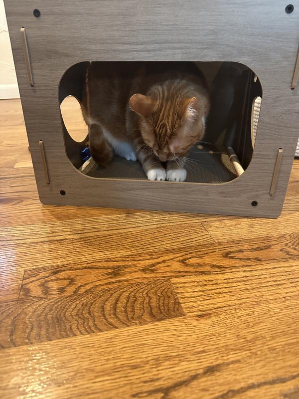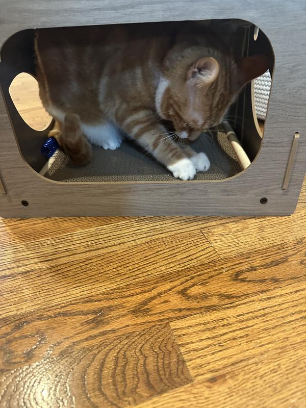 This cat house, while being quite a modern beauty to look at, was quite time consuming to put together. An additional wrench was needed and another set of hands. I had to throw a toy inside so that my cat would try entering it. There was a small bag of catnip provided too. It was very cute when she tried to play through the fish window/cut outs on the sides. My cat seemed to really get into scratching the cardboard scratch pad. If she will only scratch here, and abandon scratching my furniture, it will be well worth it, lol!
