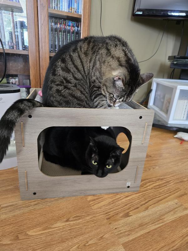Our cats absolutely love this cat house. It is easy to put together and has a cute aesthetic. Size wise, it’s most comfortable for one cat and I really love the built in scratching pad.
