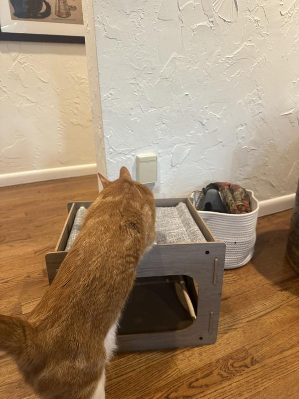 First, I like that the frame of this scratcher is solid and very sturdy, instead of just heavy duty cardboard. Second, the thickness of the fabric and construction of the hammock is fantastic - extremely durable. What was a bit more challenging - having to attach the hammock to the frame was more difficult than I expected. Because the fabric is so thick there wasn’t too much room to try to grip onto the dowel to keep it from spinning while trying to secure it/screw into the frame. I ended up brushing my hands trying to get the hammock attached. The other thing I noticed is that the dowels on the inside of the scratcher are prevents my kitty from comfortably laying inside - the dowels are a bit too uncomfortable for her, so she mainly uses the hammock attached. I may just put a cushion inside so she can use it a bit more. Overall, it’s a good piece. Compact enough that it doesn’t take up much space, very sturdy, and it blends in with our living room fairly well. If you have a cat that needs a little hiding space, and you want something relatively inexpensive but looks nice, I’d recommend this item.