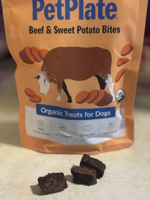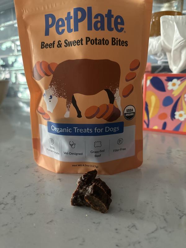 • Made with 100% human-grade and USDA organic ingredients, PetPlate's Beef and Sweet Potato treats for dogs are a nutritious, high-protein snack.