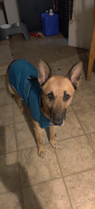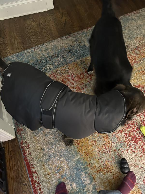 This is a well-constructed, moderate warmth jacket. I like that the outer fabric seems strong and rugged. Our dogs are Livestock Guardian Dogs, and hence are out with the herd 24/7 (with shelter, of course). Our dogs shed A LOT, and I've come to appreciate a warm but non-fuzzy lining that will not collect hair. We got the XXLarge, and it has a generous fit for our 110 lb dog. However, the length is short on our largest, 175 lb dog. The funky feature is that the closure is a velcro band that entirely encircles the body of the dog--no attachment to the actual body of the coat with the velcro, it overlaps like a belt. I think it will work out fine, and at this price this coat is a steal.