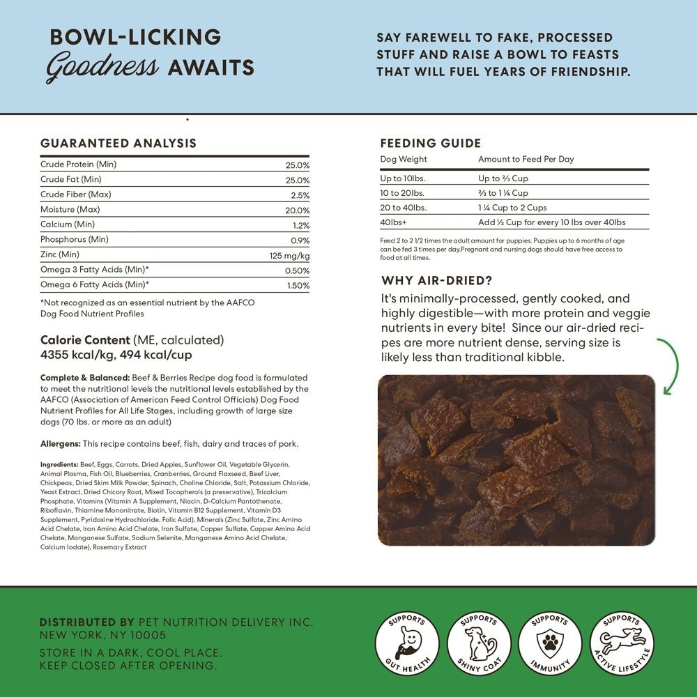 - The Pets Table Beef & Berries Grain-Free Air-Dried Dog Food—Air-dried at a low temperature for longer to help maintain optimal nutrition, freshness, and flavor.