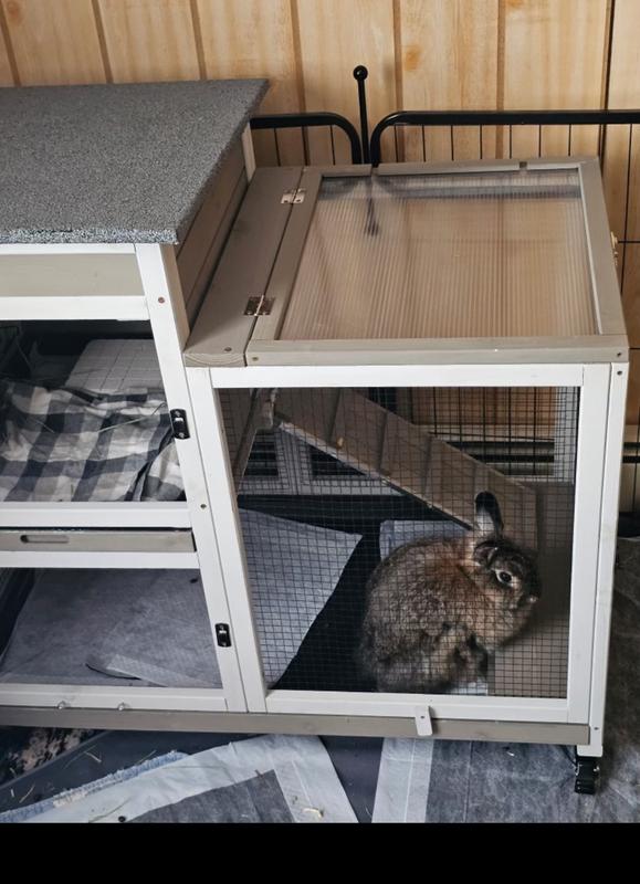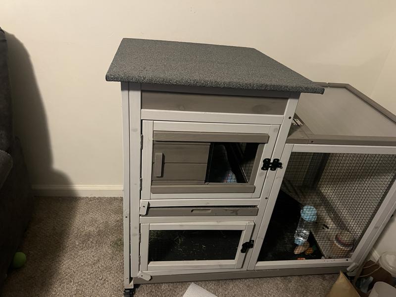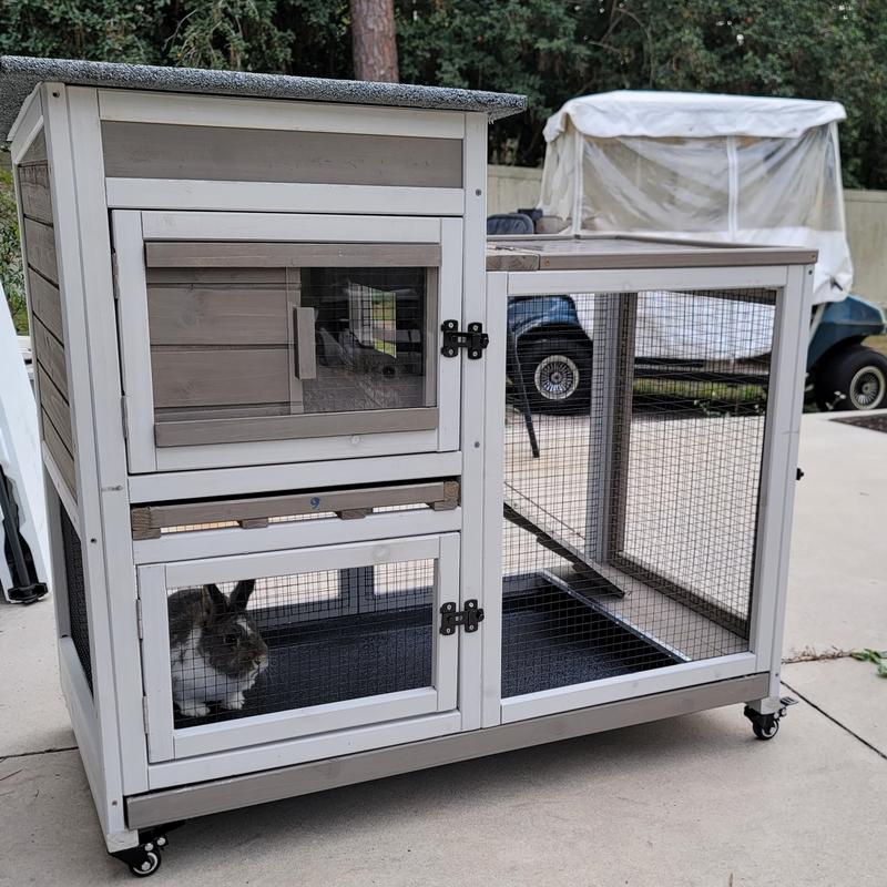 My husband and I assembled the Petscosset Indoor Wooden Rabbit Hutch with Wheels. It is well constructed and I love the two tiers. I have two small rabbits and as shown, they love their new home. Study, reliable construction complete with two pull out trays for easy cleaning. It's a win, win for everyone!