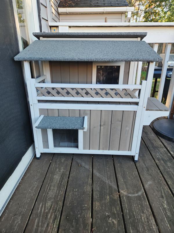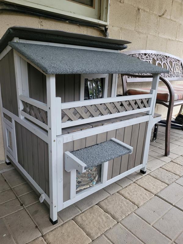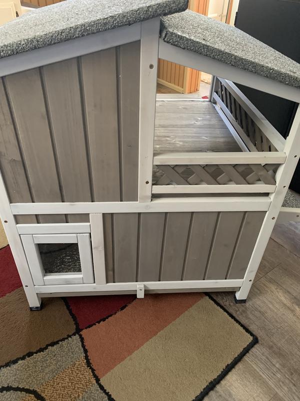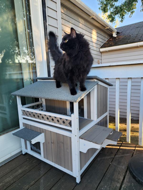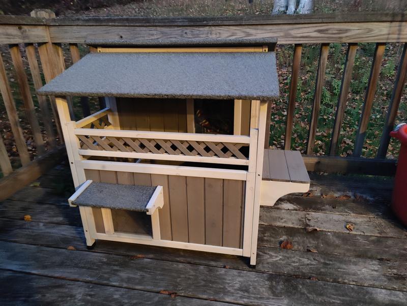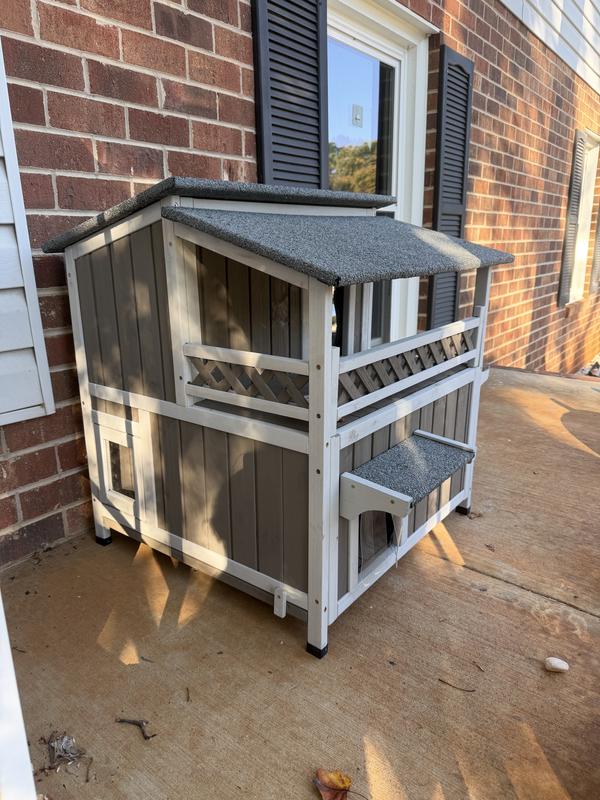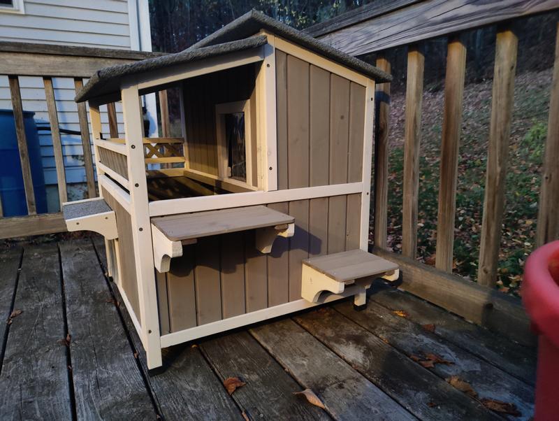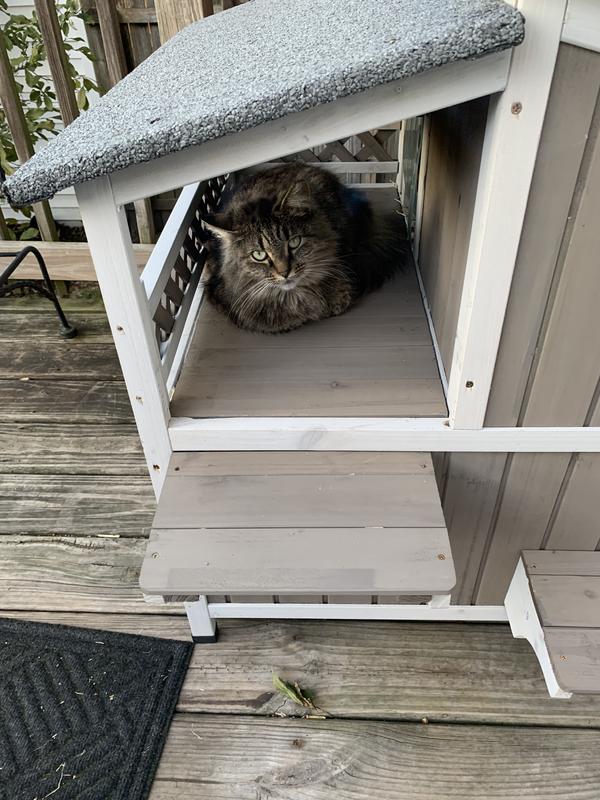 Cute house with some nice features but sadly my outdoor cat (who was a stray) won't go in it. She's a small cat and she can barely fit through the doorways. I think they spook her. Had a couple little minor defects upon delivery that doesn't affect use - one of the frame pieces was cracked and the bottom floor does have a little bit of a gap.