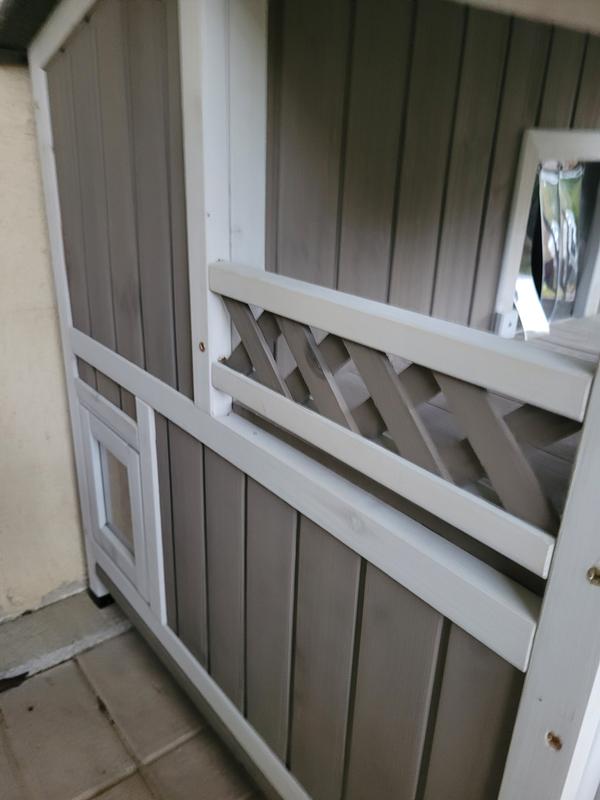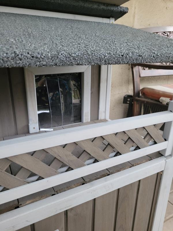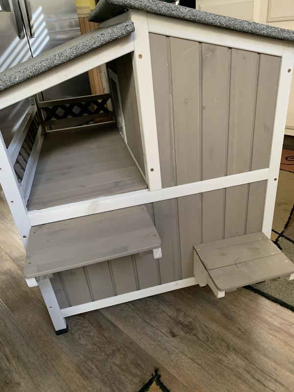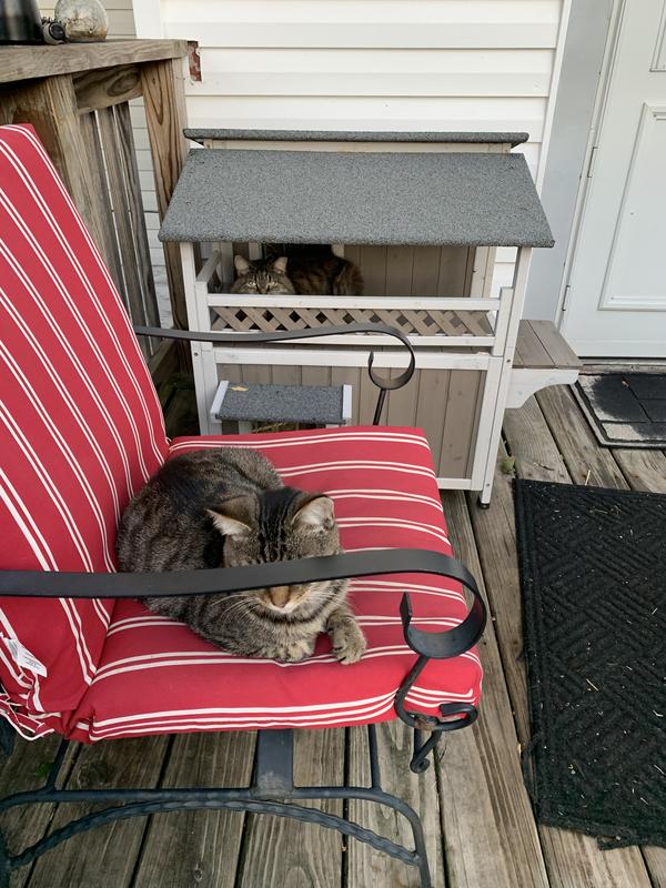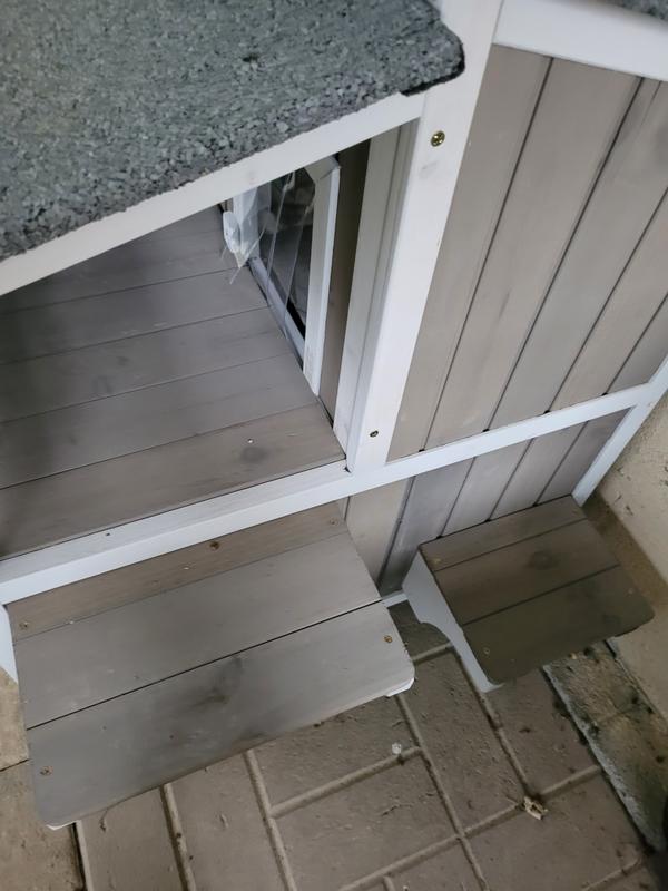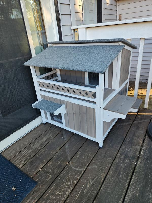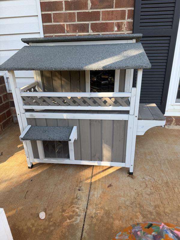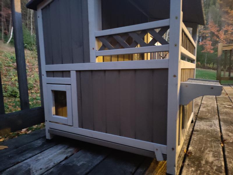 Cute house with some nice features but sadly my outdoor cat (who was a stray) won't go in it. She's a small cat and she can barely fit through the doorways. I think they spook her. Had a couple little minor defects upon delivery that doesn't affect use - one of the frame pieces was cracked and the bottom floor does have a little bit of a gap.