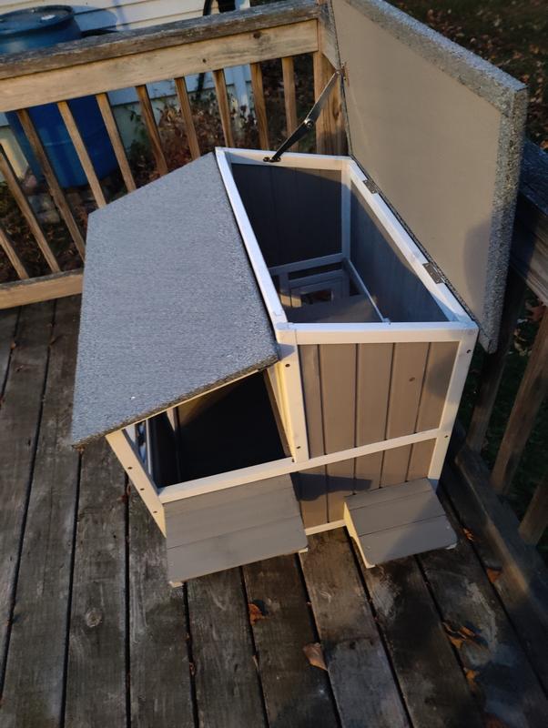 This box has great features. Two sleeping areas with cat doors, top lifts up for easy cleaning. Room for all 5 cats we took in this past year. This will be a warm safe place for them to sleep this winter. Very easy to assemble. Cats love the perches on the side and the front porch where they can eat, they also love laying on the roof.