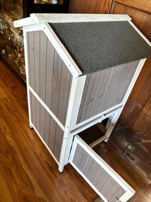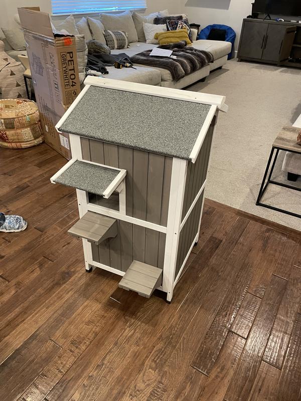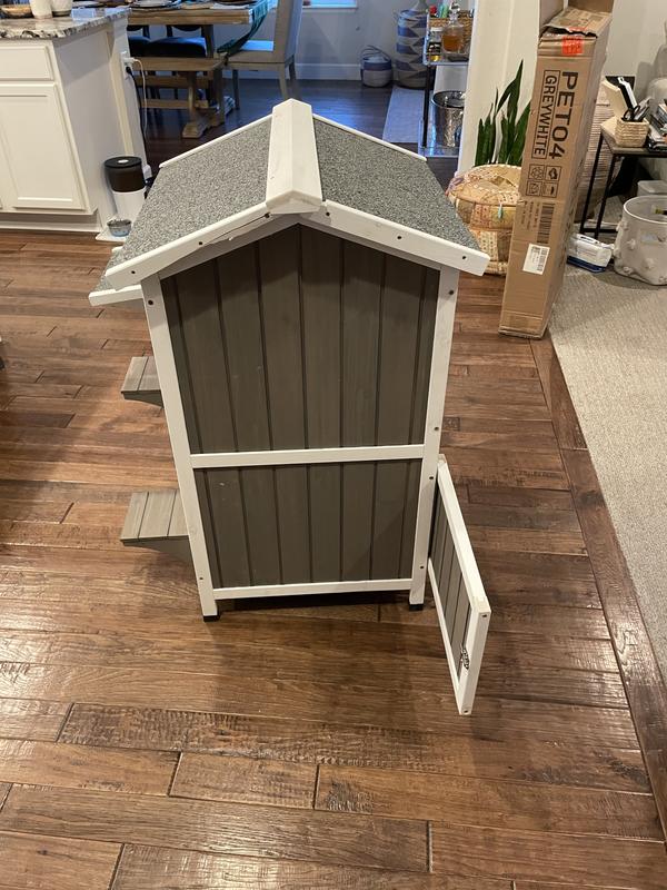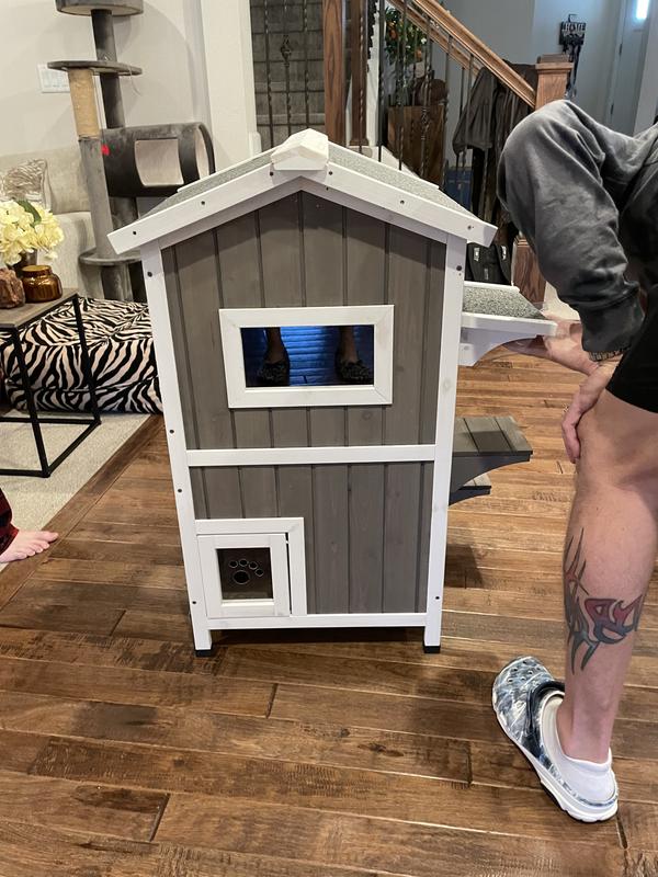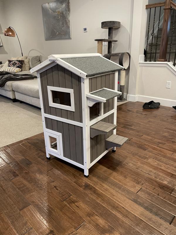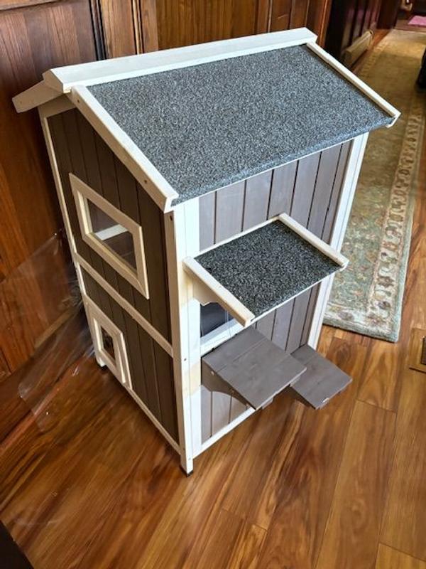 First off, I want to say it's not Chewys fault this was not as pictured and not as described. Mine showed up in a box that clearly says GRAY WHITE on it, however it was unfinished brown. I put it together and was not impressed. The roof is very heavy compared to the rest of it due to it having actual tar and real roofing material on it. This creates a safety issue because it is top heavy and the rest of the house is what I call flimsy. I'm not sure if I got a defective one that was unfinished or not but either way I would be very careful with this. I definitely would not use it for outdoor cats either, there's nothing to keep them warm or safe.