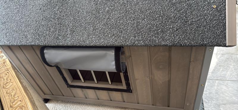 My dog loves it. It’s did not come with all the Nails that we’re supposed to be used on the doghouse it also did not come with paper instructions, and if you do not own a power tool, It’s really spacious for him and the window is so perfect since I could either just have it up or down when it’s cold or hot so it’s really convenient and is really cute in my backyard as well. it will be really difficult or even impossible to build it since you need a power tool to put most of these nails in it took me around an hour and a half to build it with the help of two other people, but overall, the doghouse is really nice. I like the window feature since I can put it either up or down when it’s hot or cold and then inside is really spacious perfect for big dogs.