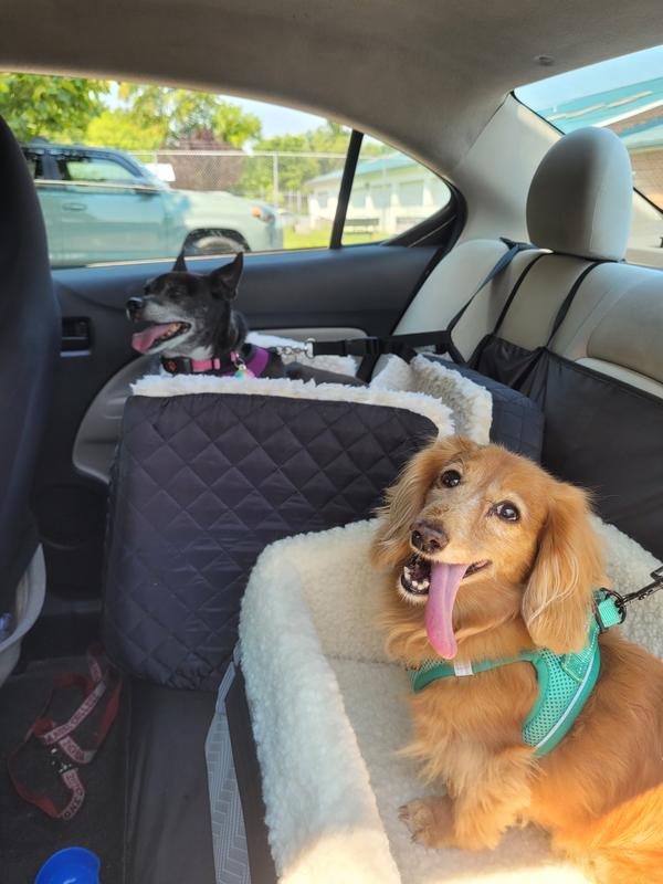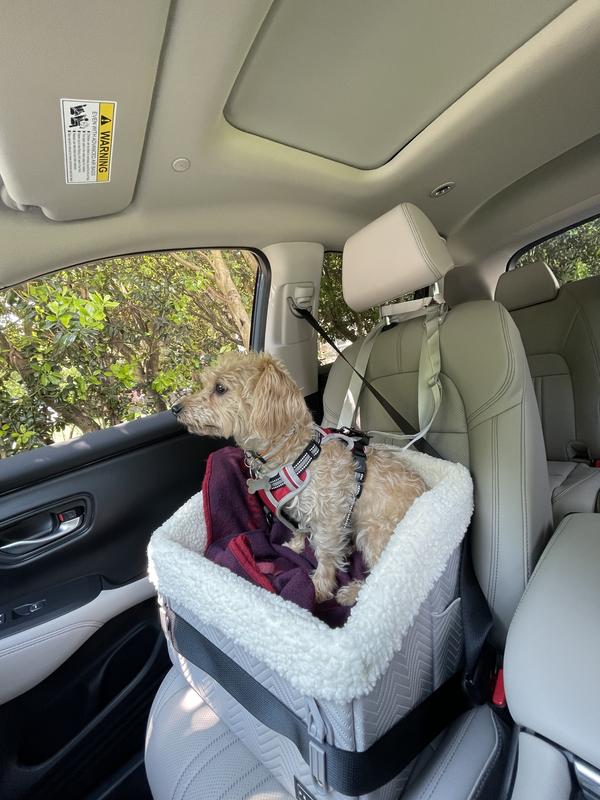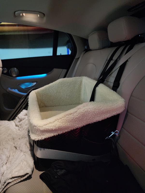 Car seat is sturdy, but be aware that the seatbelt is attached to the car's headrest, not the car seat. Also, the fleece lining is only on the sides. This makes the bottom part waterproof (the part the dog sits on) but then your dog will slide around on it. I'd rather just have a washable soft car seat liner instead of the slidy plastic. I put a cushion in there, but the cushion slides around too. Not a deal breaker though. It's a sturdy seat that lifts your pup up high enough to see out of the window, which in our case alleviated travel sickness in our dog.