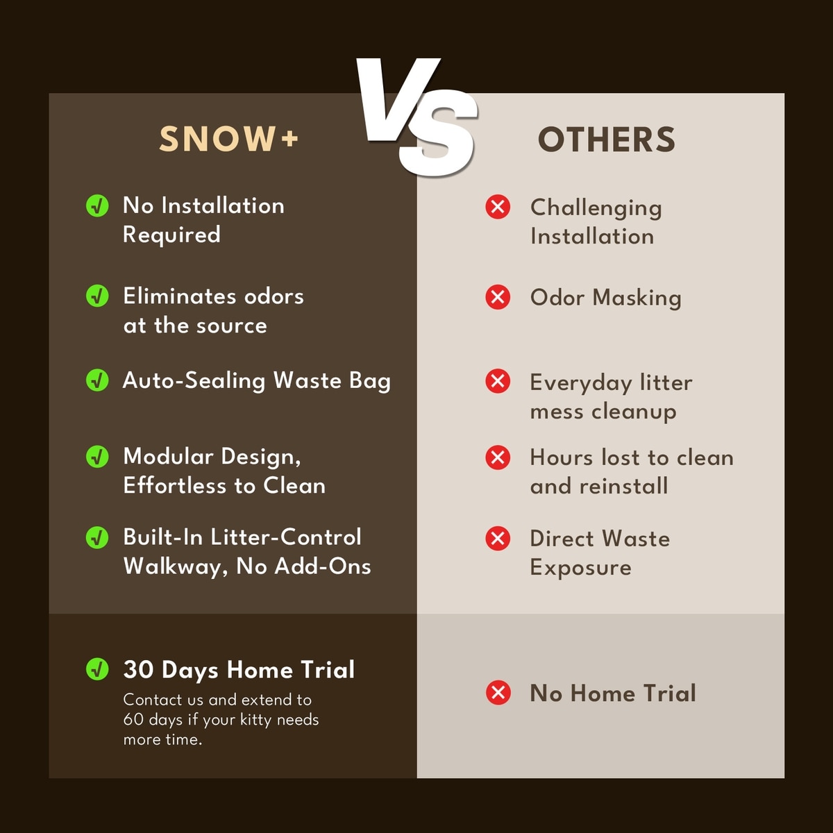 Tips on acclimate cats to the SNOW+ litter box: For shy cats, leave the bonnet off and turn off SNOW+. You can also place the old, uncleaned litter box nearby, add used litter, sprinkle catnip in the walkway, and delay installing the fragrance box to help them adjust.. SNOW+ is suitable for cats older than 6 months and weighing above 3.3 lbs.Note that we don't suggest pregnant cats use automatic litter boxes since it's possible that they labor in the box that they are familiar with. We also do not suggest kittens that do not weigh enough to use an automatic litter box for potential safety reasons. It is recommended to place SNOW+ near the cat's original litter box to aid in the cat's adaptation. Ensure it is placed on a flat, stable surface near a power outlet, avoiding soft or uneven surfaces. Leave at least 2 inches of space around the device for the safety sensor and avoid placing it against a wall. Do not place the device outdoors or in high heat or humid areas.