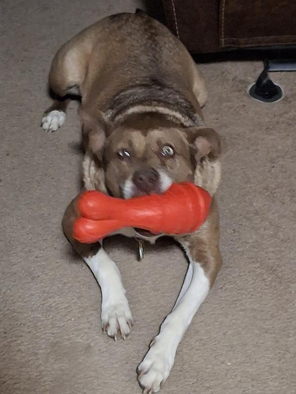 I had pucked one of these up at Marshalls and my large pit loved it and it held up for months, including the squeaker. Bought 2 more at Chewy and while also durable and good for chewing, the squeakers in both stopped working the first day. I would buy again but would be 5 stars if the squeakers would last for weeks or longer.