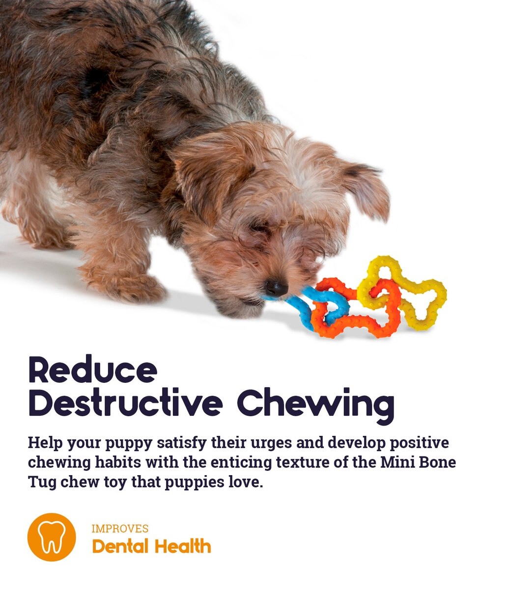 Petstages makes alternatives to wood, rawhide and antler chews that let your pup chew without causing you worry. Their puppy chews include the Mini Cool Chew, which can be frozen for soothing relief, and the Mini Dental Rope Chew, with knots and rubber rings. Petstages also offers Orka chews for tough chewers.