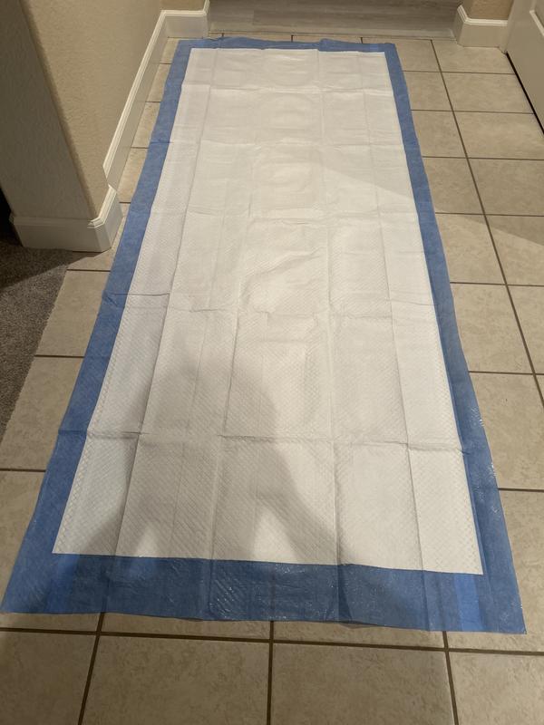 Honestly I never realized how giant these would be! My chihuahua is only 5lbs so I figured it would be good to get a giant pee pad for my room. Anyways I decided to test it out & use it at the pet hospital I work at! I will post a new rating once I’ve used it long enough. They last forever with my small pup, & the back side has peel off plastic so it can stay put on the floor. There isn’t much odor either, it’s really well made. Usually my cats tear up the pee pads, but I think it may have been too large for them to mess with it.