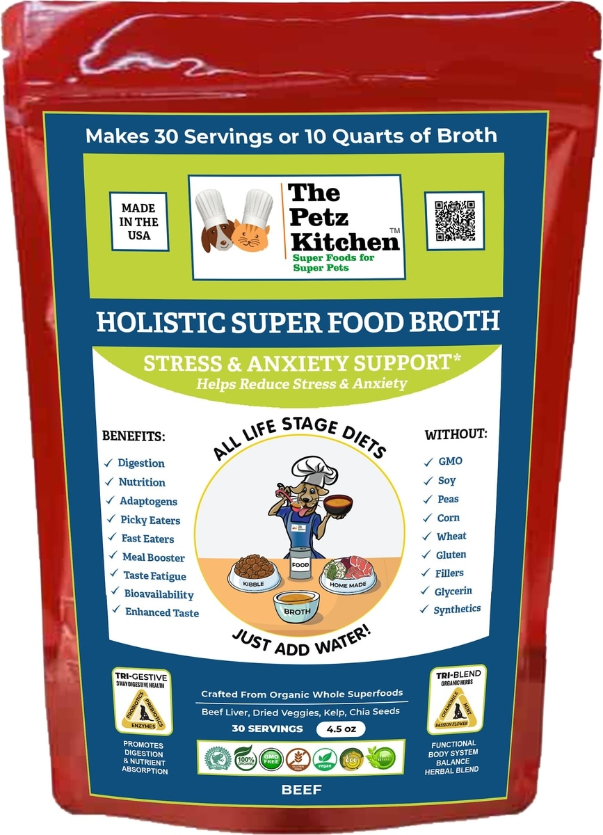 The Petz Kitchen Holistic Super Food Broth Anxiety Support Beef Flavor Concentrate Powder Dog & Cat Supplement, 4.5-oz bag