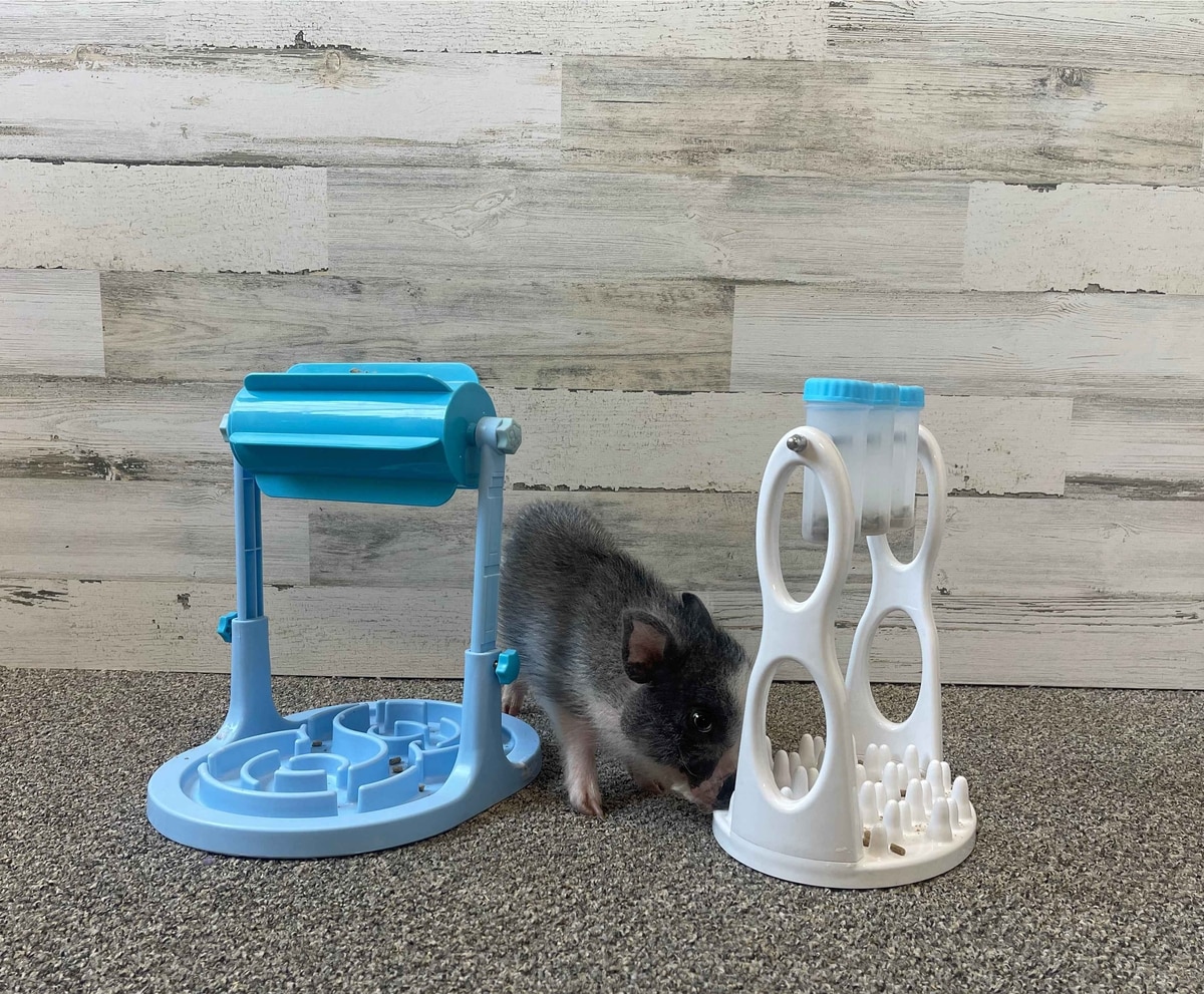 Neither one of these feeders work for a pig like they are advertised for. My little pot belly piglet knows them over and gets stuck in them. The only way I can use them is to take the top parts off and just use as slow feeder by putting food in the bottom dish. Pretty disappointing for the price.