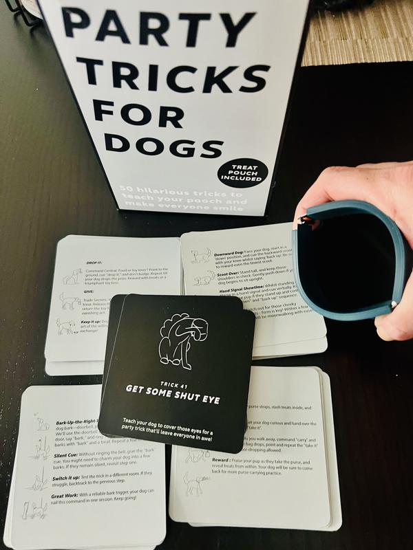 Party Tricks for dogs is a set of 50 cards with tricks to teach your dogs.Easy to read cards ,complete instructions on each trick.Comes with a cute treat pouch.These