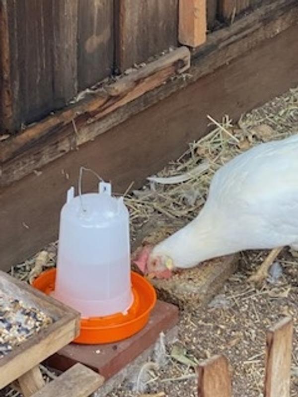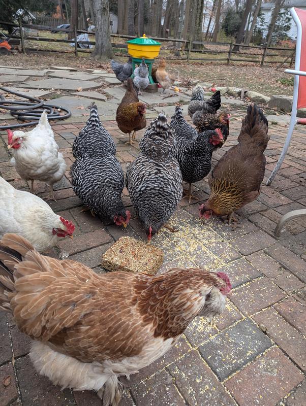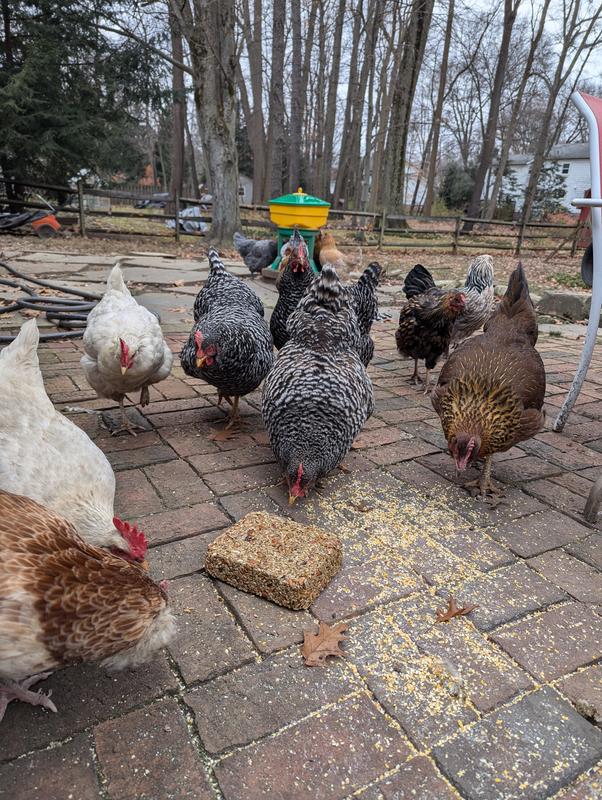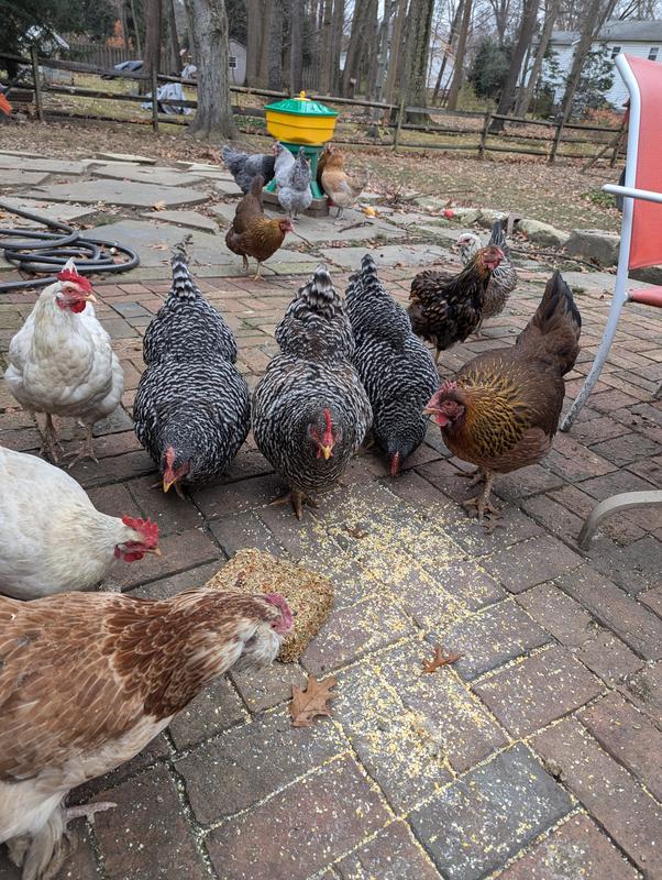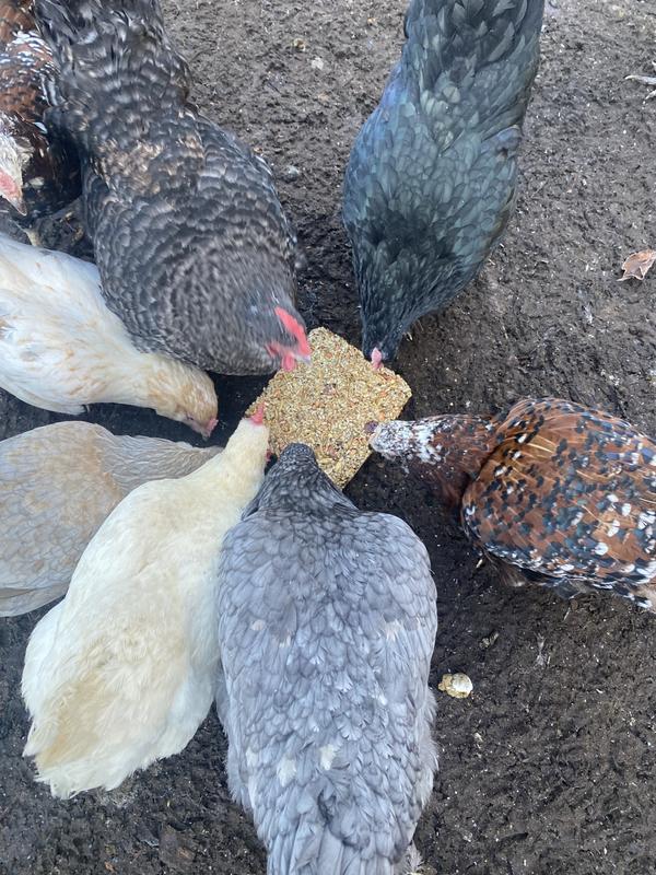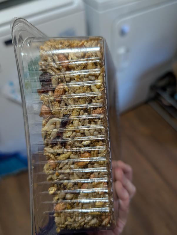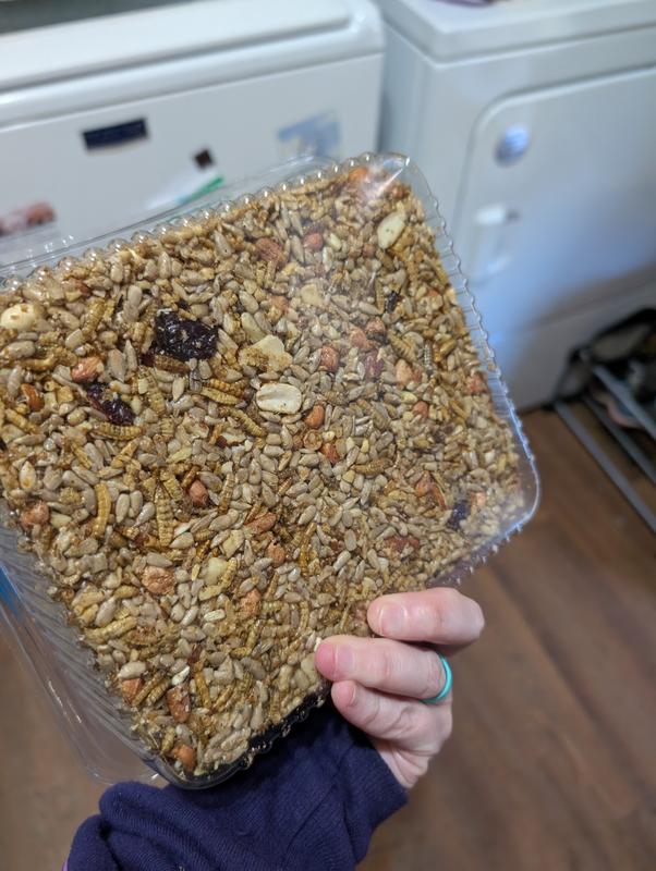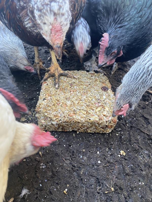 This cake takes a larger suet or cake type holder (usually they hold 2 to 3 pounds) . It should be placed low so chickens can reach the cake. Or it can be placed on a platform feeder at ground level. The cake itself is 7.25" high x 2" wide and 6.25" deep.