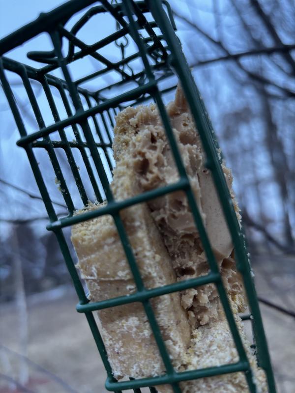 This is an interesting product. It was delivered frozen solid but once it thawed out it is easily spreadable. It smells and looks like peanut butter(one of the main ingredients). Not many birds seem interested in it but it is the middle of winter so there aren’t many around right now.