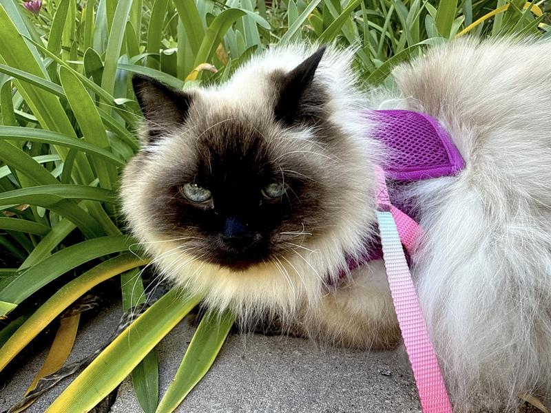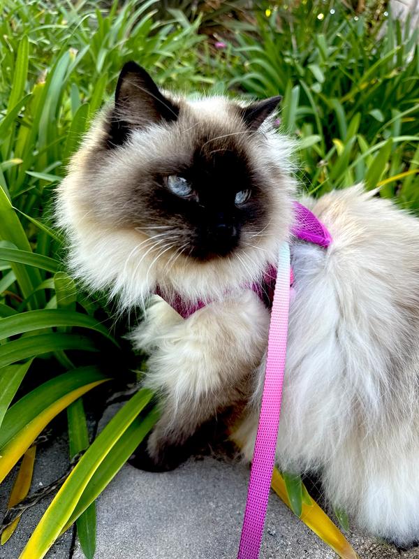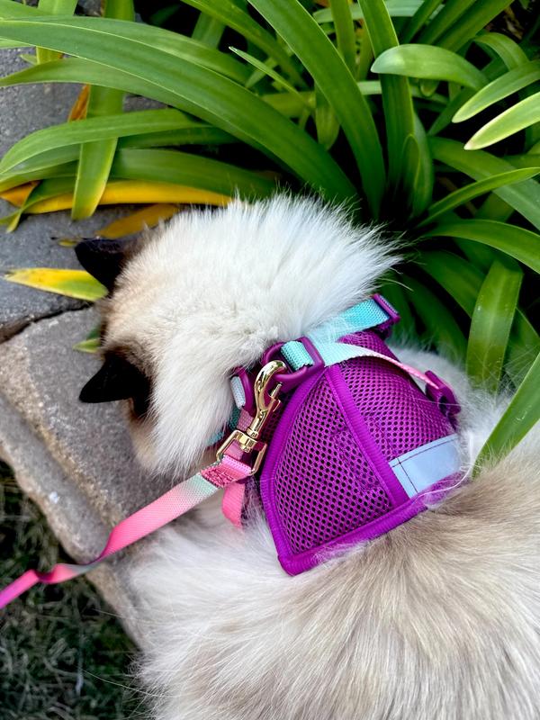 I am beyond impressed with this Pink Papyrus cat harness! The purple color is even more stunning in person, rich, vibrant, and seriously beautiful. It fits my cat comfortably and securely without restricting movement, and the breathable material keeps her cool even on longer outings. I especially love the built in spot for an Apple AirTag, it gives me so much peace of mind knowing I can track her just in case. The reflective strips are a huge bonus for visibility, and overall the quality feels very well made and thoughtfully designed. Best part, it comes with a matching leash!! Stylish, safe, and comfortable! This harness and leash set checks every single box.
