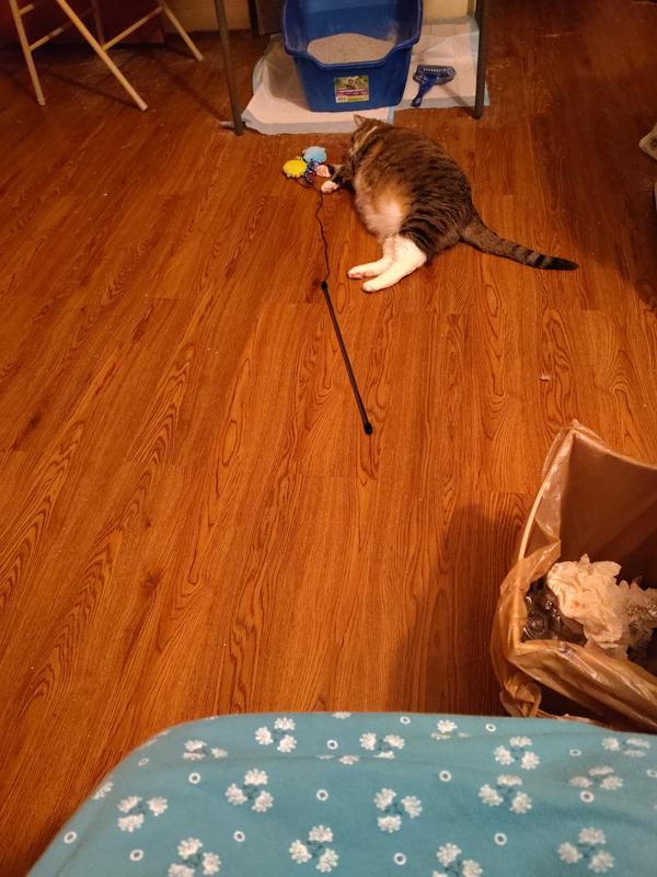Bella absolutely ADORES this toy! She gets so excited when it is brought out! She never tires of it and we play till she tires out! She loves the curly ribbons. I watched this butterball of a cat LEAP into the air to catch the ribbons!