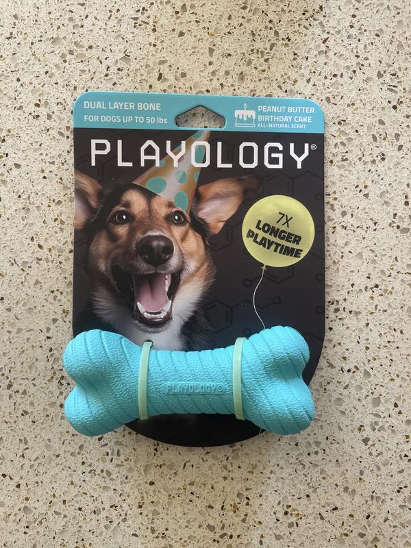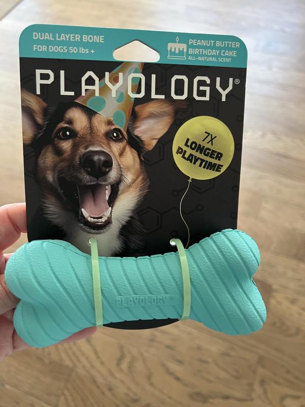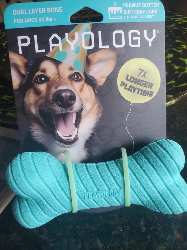 Playology Dual Layer Bone Peanut Butter Birthday Cake Tough Dog Chew Toy, Blue, Small