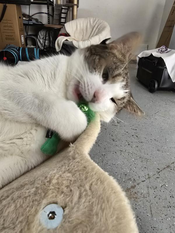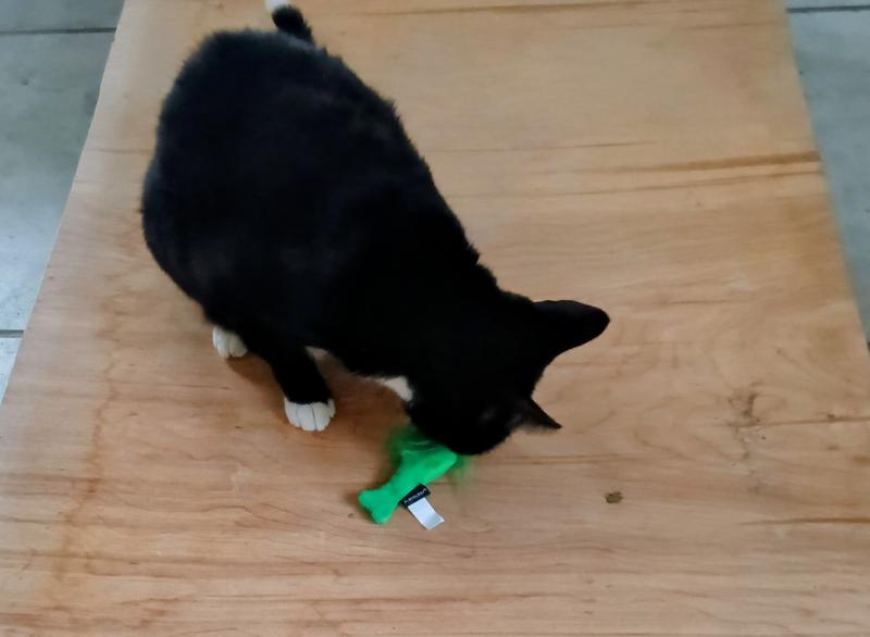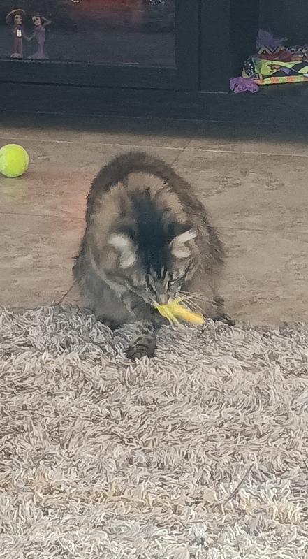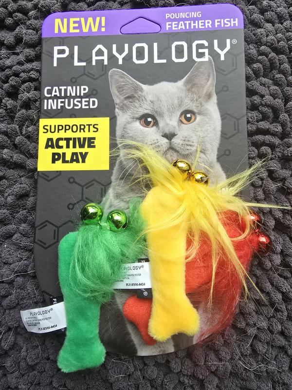 From the moment I took this out of the box, Nermal was interested. She's an older kitty, so she doesn't play a lot anymore due to arthritis, but she loved these fish immediately. I'm sure the catnip played a role in that, as did the ability to roll around with them on the floor. These fish are also very beautiful, and the feathers add to their charm. I'm sure Nermal will get much more playtime out of these, and hopefully Garfield will get in on the fun too once his arthritis is more under control. He loves to carry things in his mouth and present them as presents to me, and these are perfect for that too.