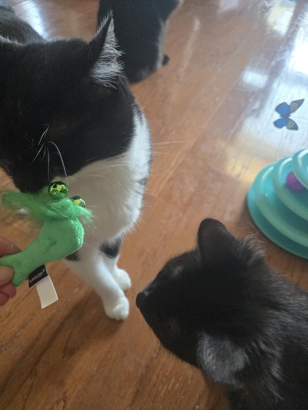 These little toys are very cute! All of my fur babies wanted to help get them off the card they were attached to. They are nice and soft and have a Bell and some little feathers. My babies really enjoyed them the first day, and then kind of lost interest after that. They do play with them but I'm not sure that the catnip is strong enough. I will probably put them in a bag with catnip too make it smell more potent. I would recommend these toys because they are a good size for them to grab with their paws and run around with them in their mouths.