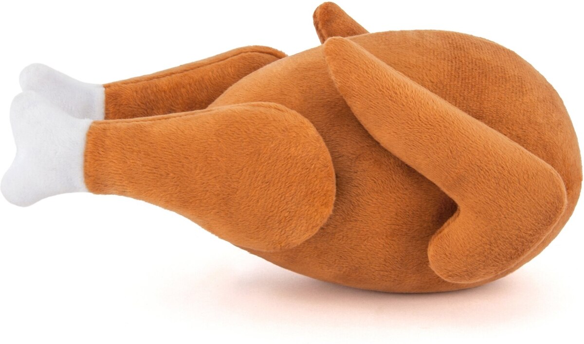 My Goldendoodle likes to sleep on her back and she looks just like a Rotisserie chicken -or a turkey. This toy is extremely well-made and durable. Its squeaker feels like a silicone squeaky-ball. The drumsticks are attached together, so they comically flop about, but I do worry a tug-a-war over it might tear the drumsticks. Overall, it's the best for us! My spouse died when he saw it.