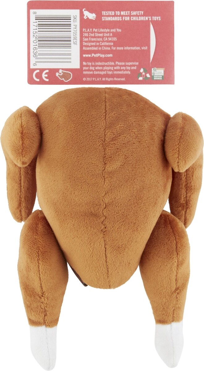 - Holiday-ready turkey plush toy features a built in squeaker and crinkly material for doggy-approved playtime.