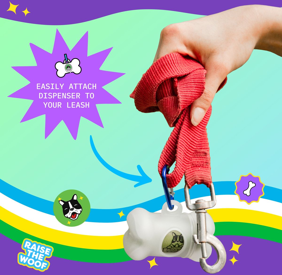 This dispenser easily attaches to your leash or belt with a metal carabiner clip or Velcro strap.