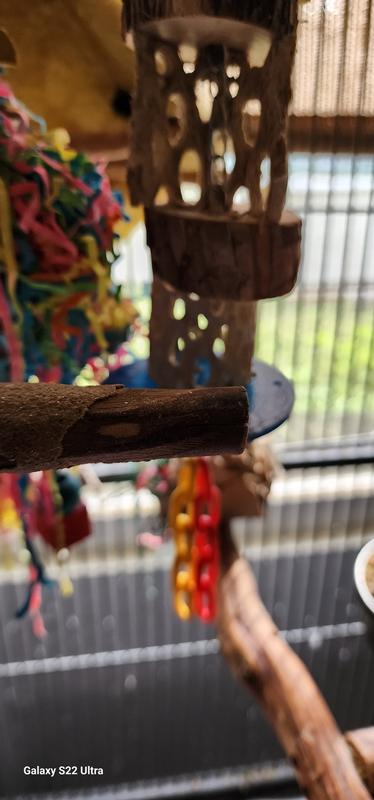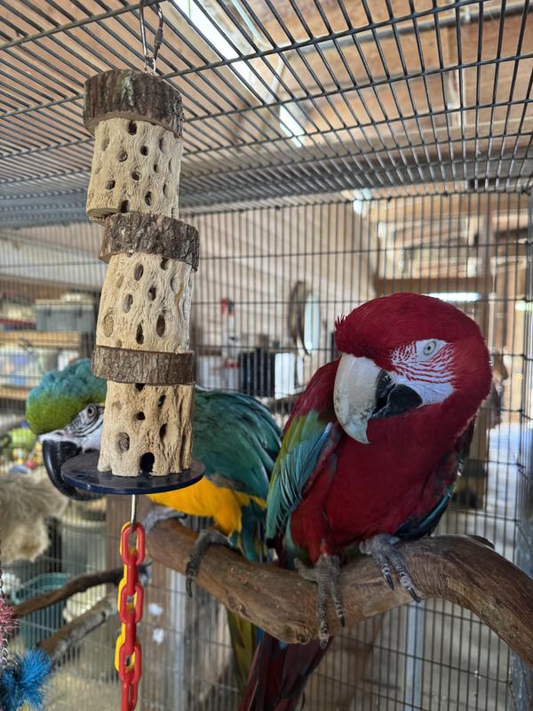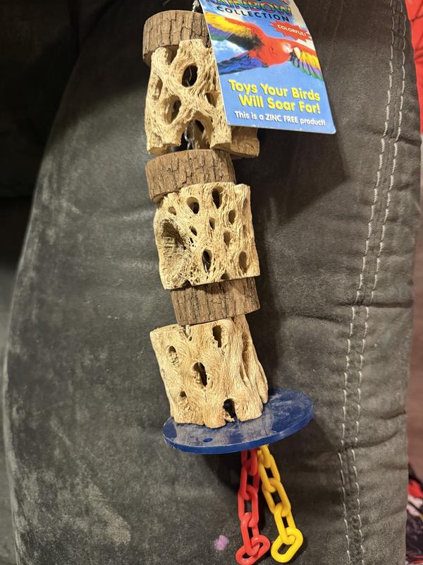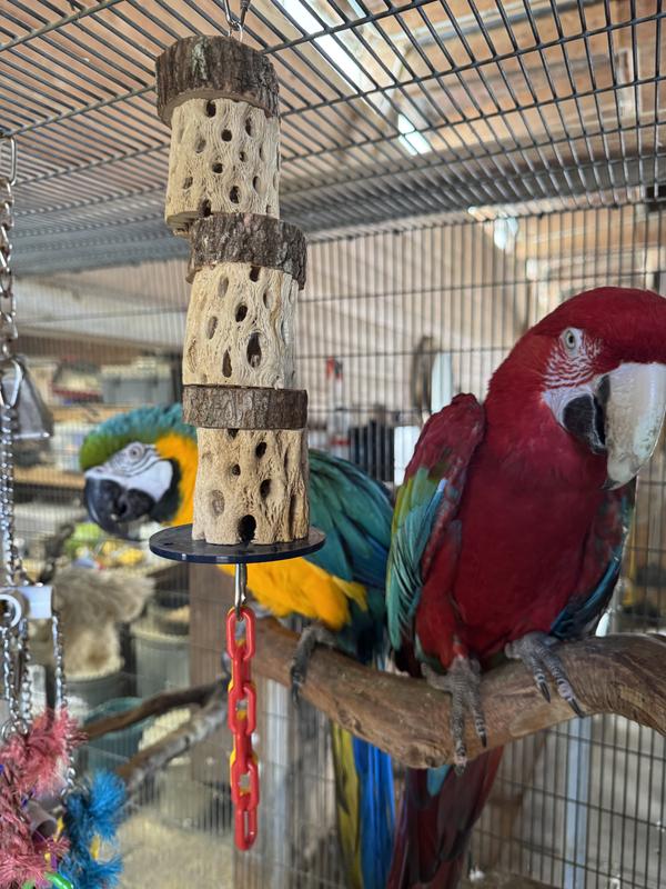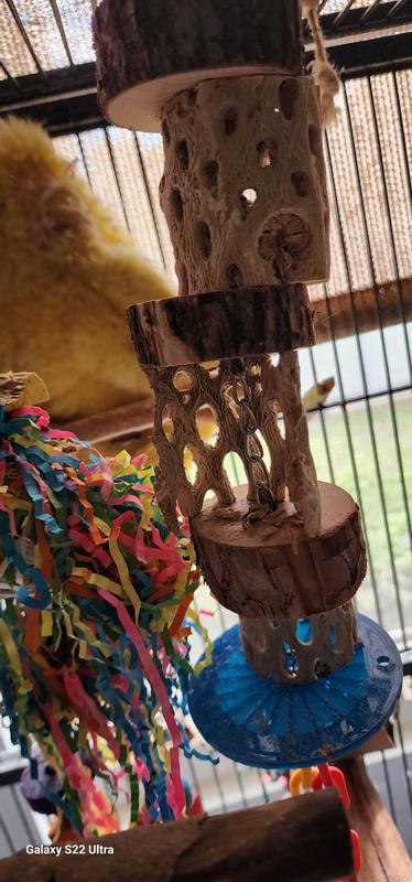 I decided to try this wood toy for my macaws. I generally buy them the colored, shaped pine block toys, which they love to shred, but thought they might enjoy something different. They were immediately curious about the toy and came right over to check it out! The cholla wood and ribbon wood pieces are harder than pine and this toy is holding up to their beaks much longer than the pine blocks do. I like that this toy is made of natural woods and the holes in the cholla are great for hiding treats and scraps of paper for shredding! This toy has been a nice addition to my macaw’s environment!