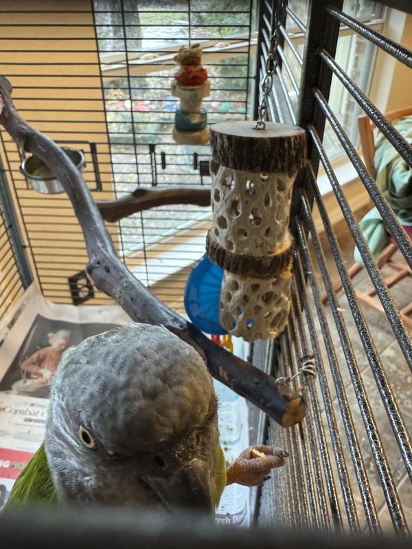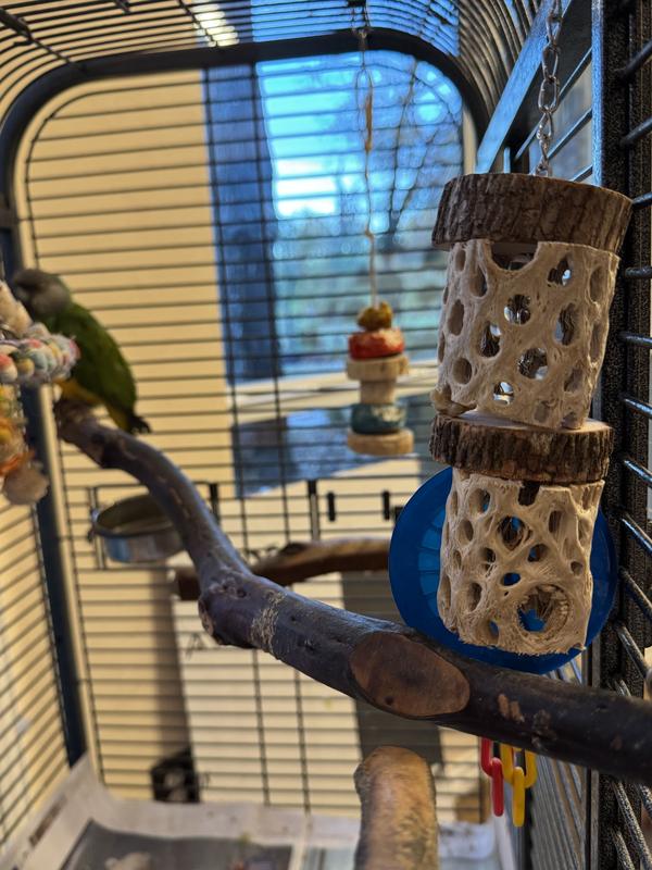 I love the natural wood elements in this toy and how it encourages natural foraging. Like any new toy, the birds are a bit wary. To encourage engagement, I have been sticking little pieces of walnut and treats into the wood hoping they’ll dig in and grab them! Definitely prefer these types of toys over plastic.