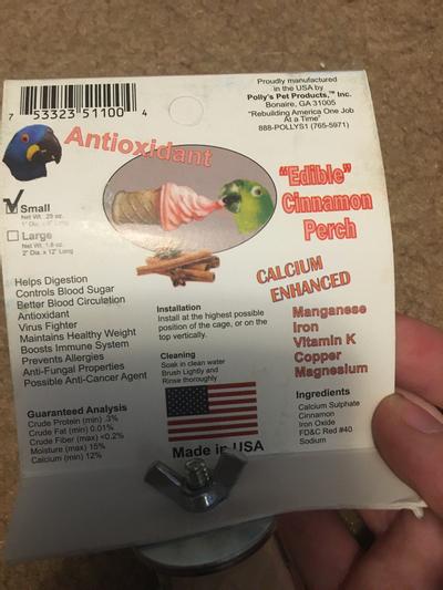 I bought this for my cockatiels and they love it. I noticed it also helps keep their beak trimmed as they nibble. It has calcium & a small amount of cinnamon which is a natural antioxidant. Cinnamon has many natural healing benefits.