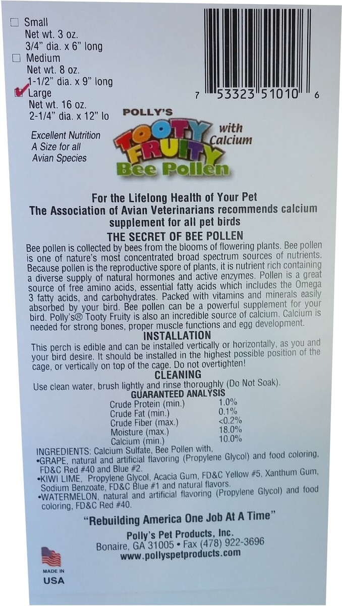 Polly's Pet Products Tooty Fruity Bee Pollen Large Bird Perch, Flavor Varies