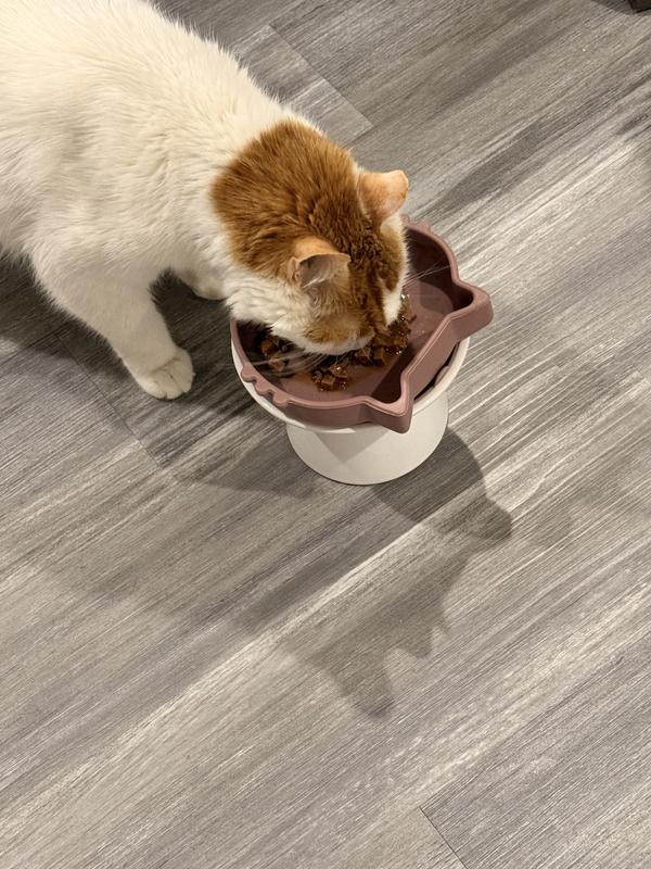 Muffins was very comfortable eating out of this bowl, he does not have a hard time any longer getting his food from the bowl.. I love how it suctions to the ceramic